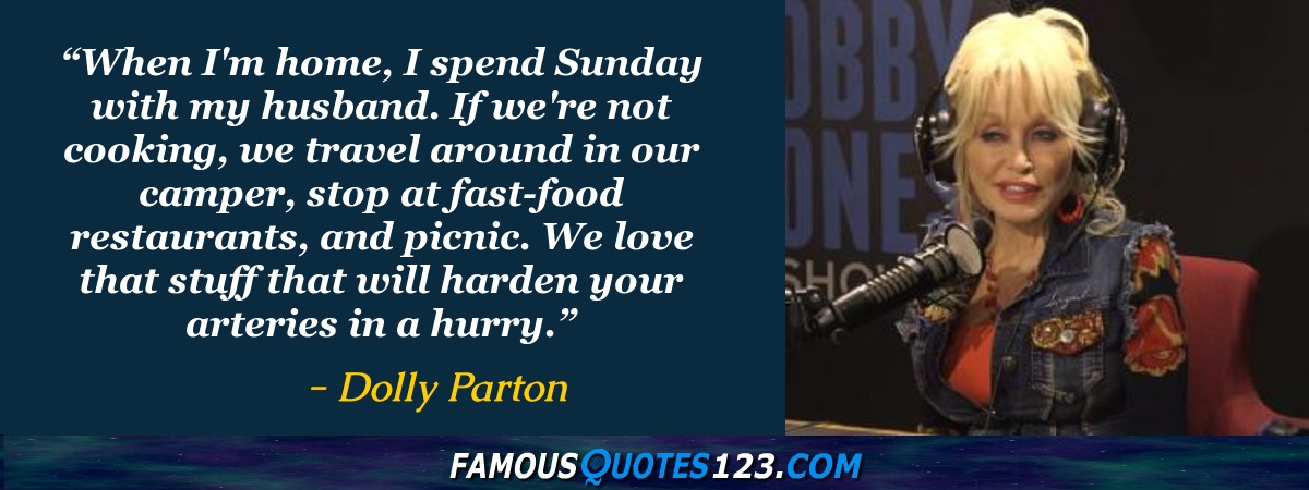 When I'm home, I spend Sunday with my husband. If we're not cooking, we travel around in our camper, stop at fast-food restaurants, and picnic. We love that stuff that will harden your arteries in a hurry.