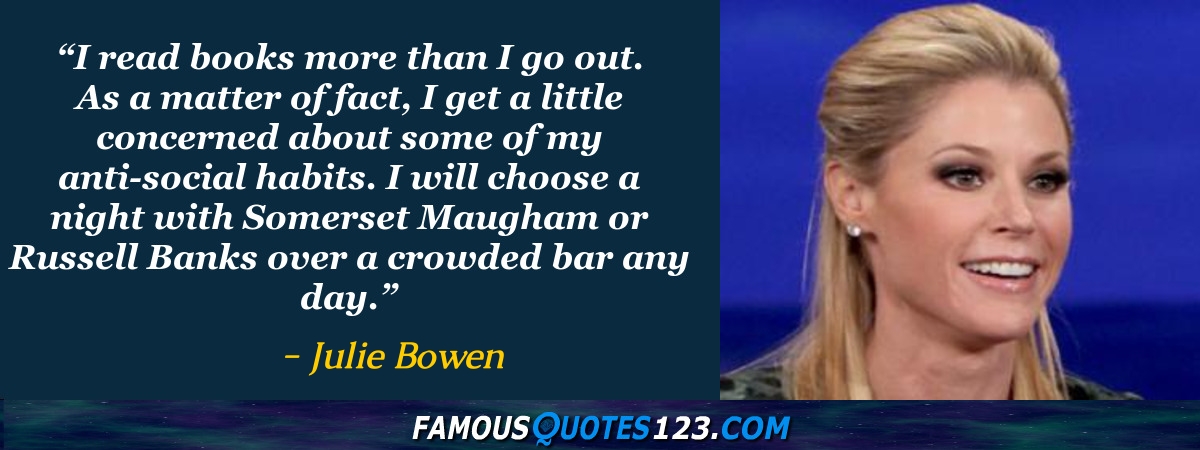 I read books more than I go out. As a matter of fact, I get a little concerned about some of my anti-social habits. I will choose a night with Somerset Maugham or Russell Banks over a crowded bar any day.