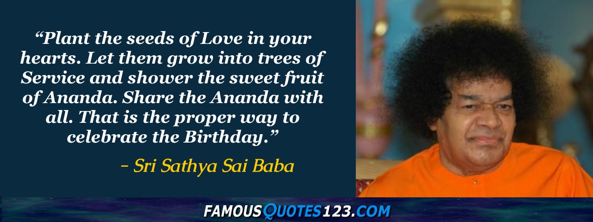 Plant the seeds of Love in your hearts. Let them grow into trees of Service and shower the sweet fruit of Ananda. Share the Ananda with all. That is the proper way to celebrate the Birthday.