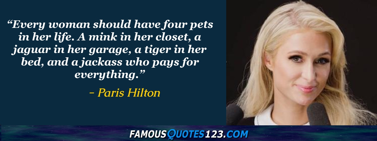 Every woman should have four pets in her life. A mink in her closet, a jaguar in her garage, a tiger in her bed, and a jackass who pays for everything.